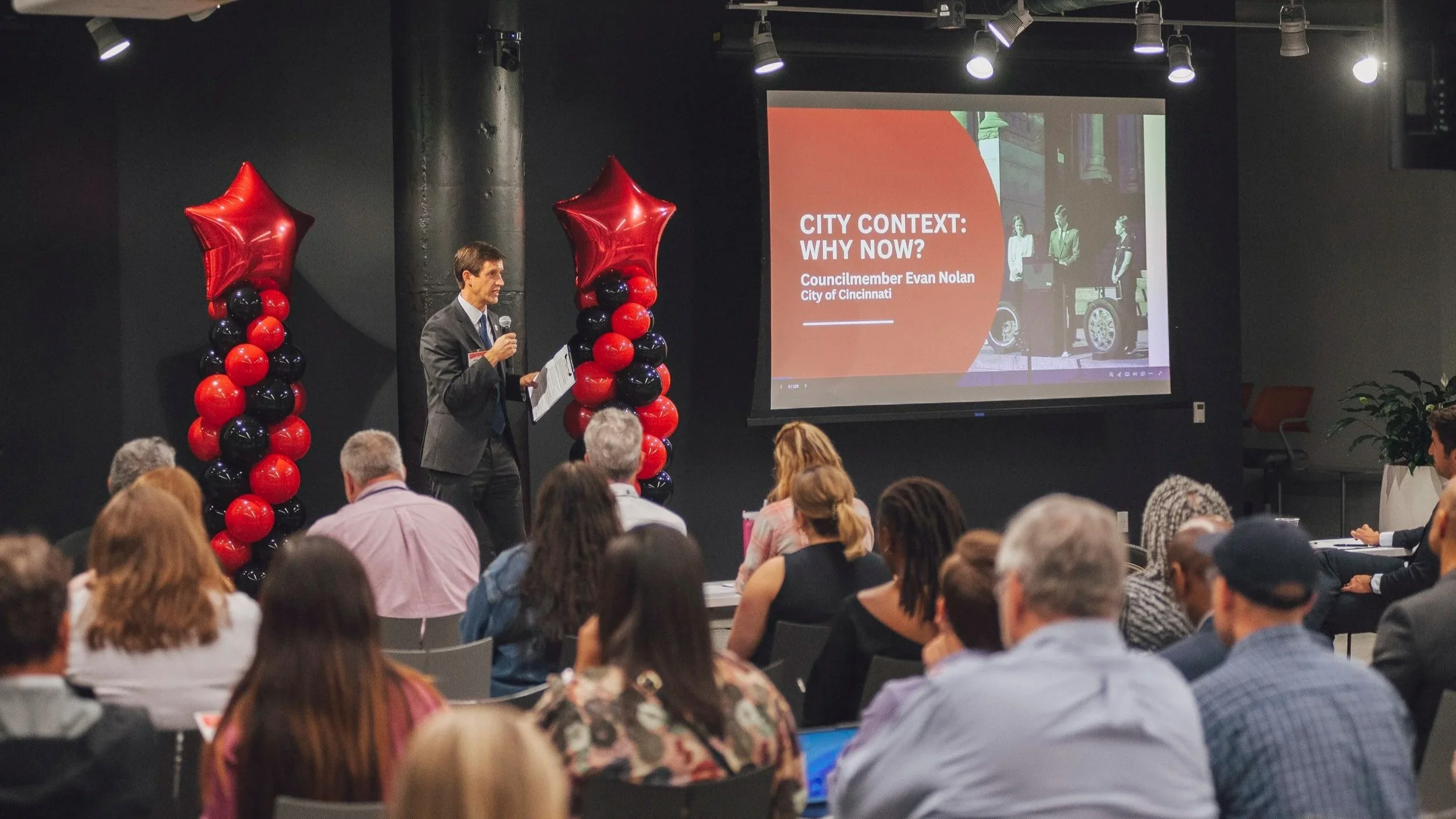 City of Cincinnati Council Member Evan Nolan speaks to audience and participants of the Pave The Way! Social Innovation Lab at 1819 Innovation Hub.
